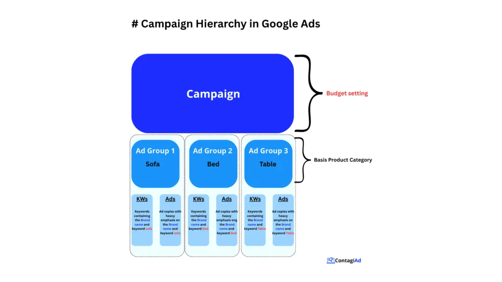 Lets discuss the basic hierarchy of a search campaign inside Google Ads platform. At the top level, you have the campaign itself, where you set your overall budget. Within this campaign, there are multiple ad groups, each focused on a specific product category (such as Sofas, Beds, and Tables). Inside each ad group, you define target relevant keywords and create ad copies tailored to that product. This structure helps you organize your ads for better control and allows for targeted messaging based on the product category.