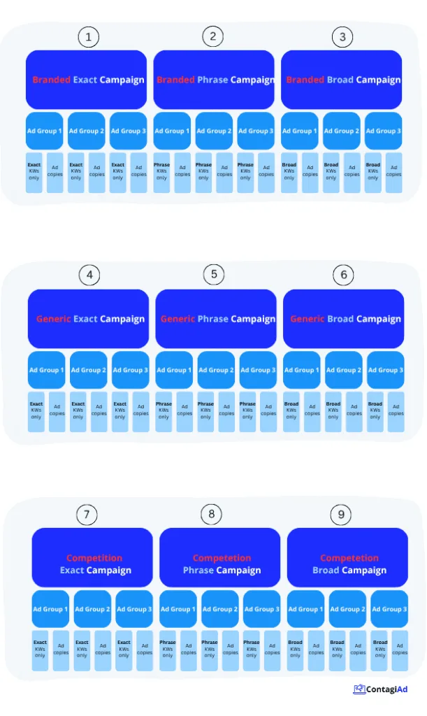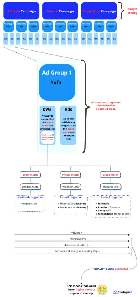 If your Quality Score drops, you will need to pay more to secure top ad positions, increasing your overall costs and CPC or CPA. To address this problem of broad and phrase match types consuming your budget on irrelevant searches, you should create separate campaigns for each match type. This approach results in nine campaigns: three for the brand with all match types, three for generic campaigns, and three for competition campaigns.