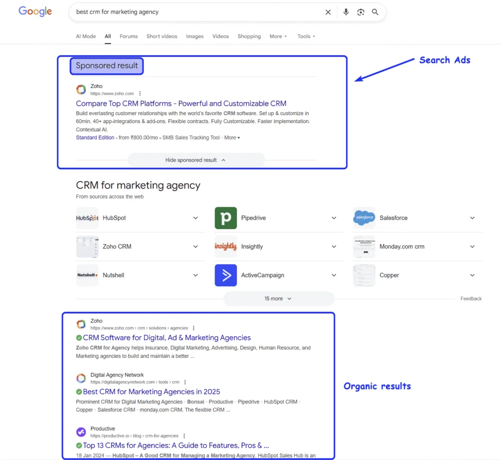 A Google Search campaign is a type of paid advertisement that appears on search engine results pages (SERPs). These ads are triggered when someone types a query into Google or another search engine, and they typically appear above or below the organic search results. For example, when I typed ‘best CRM for small businesses,’ I got a result for Zoho, which is an example of a search ad. You can easily spot ads in Google search results by looking for the small “Sponsored results” label next to them. This label clearly shows which results are paid ads and which are organic listings